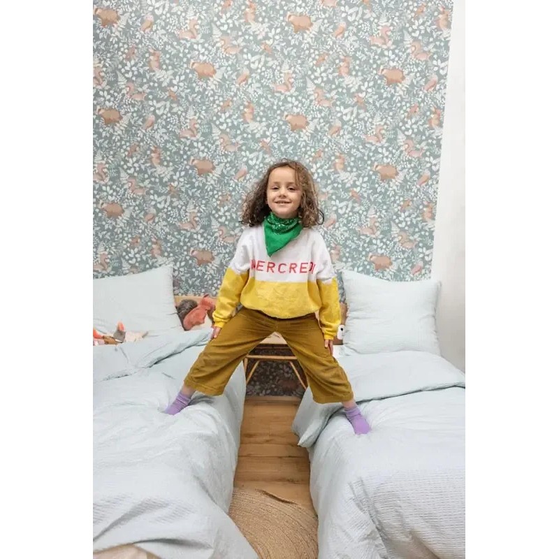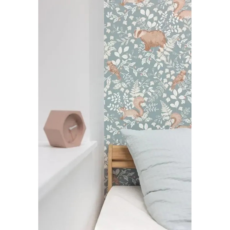 Papel pintado infantil ardillas, búhos y animales del bosque verde menta. Caselio Autour Du Monde, papel de pared calidad tejido no tejido lavable. Medidas: 53 cm x 10 metros