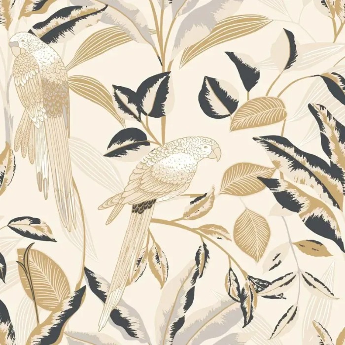 Papel pintado para salón tonos pastel, loros y plantas exóticas. Caselio Golden Age, papel de pared calidad tejido no tejido lavable. Medidas: 53 cm x 10 metros