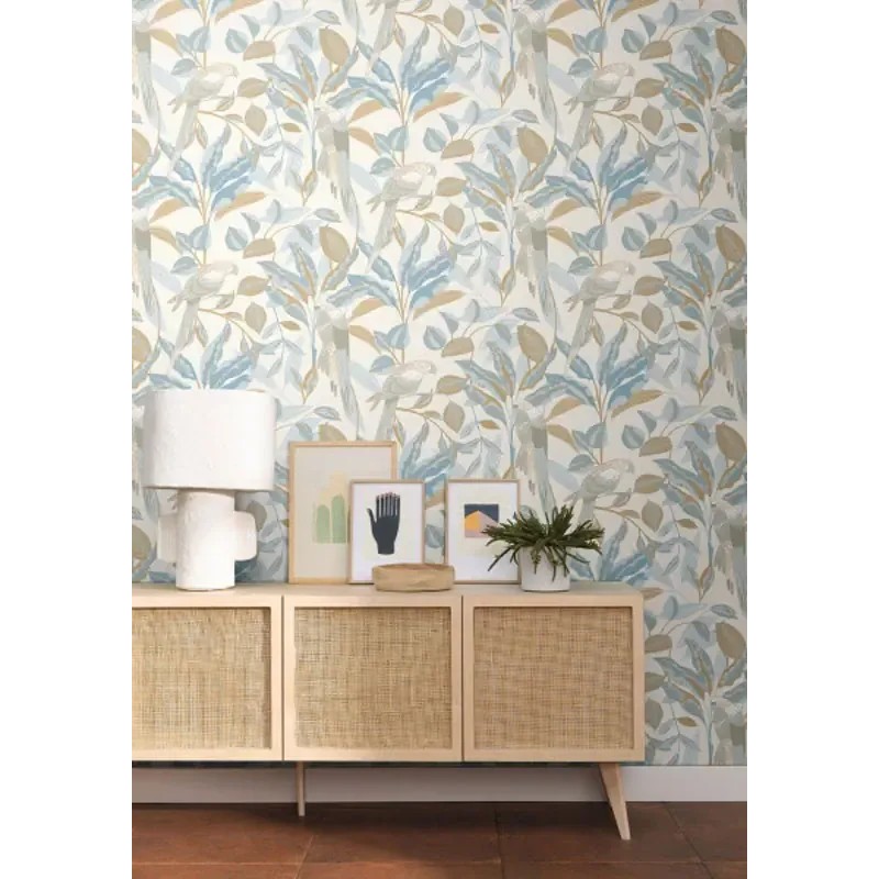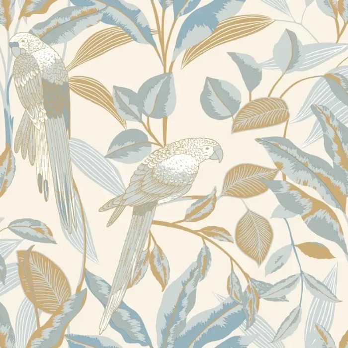 Papel pintado para salón tonos pastel, plantas exóticas y loros. Caselio Golden Age, papel de pared calidad tejido no tejido lavable. Medidas: 53 cm x 10 metros