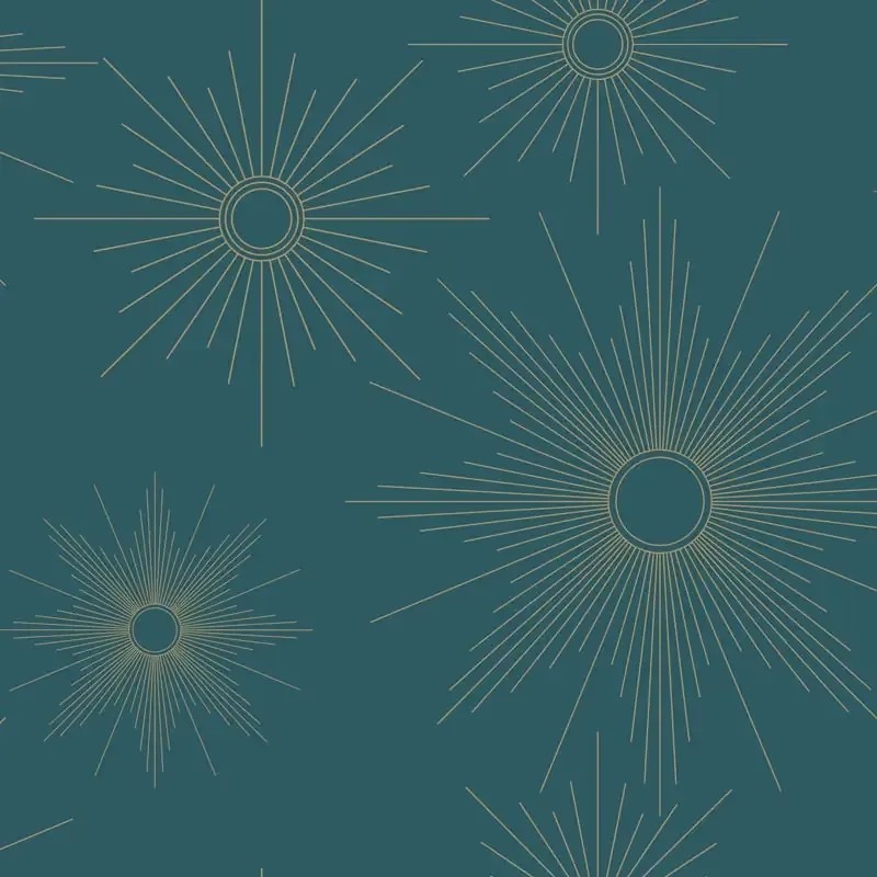 Art-Déco-Tapete in Grün mit goldenen Sternen. Caselio Golden Age, waschbare Vliestapete. Maße: 53 cm x 10 metros