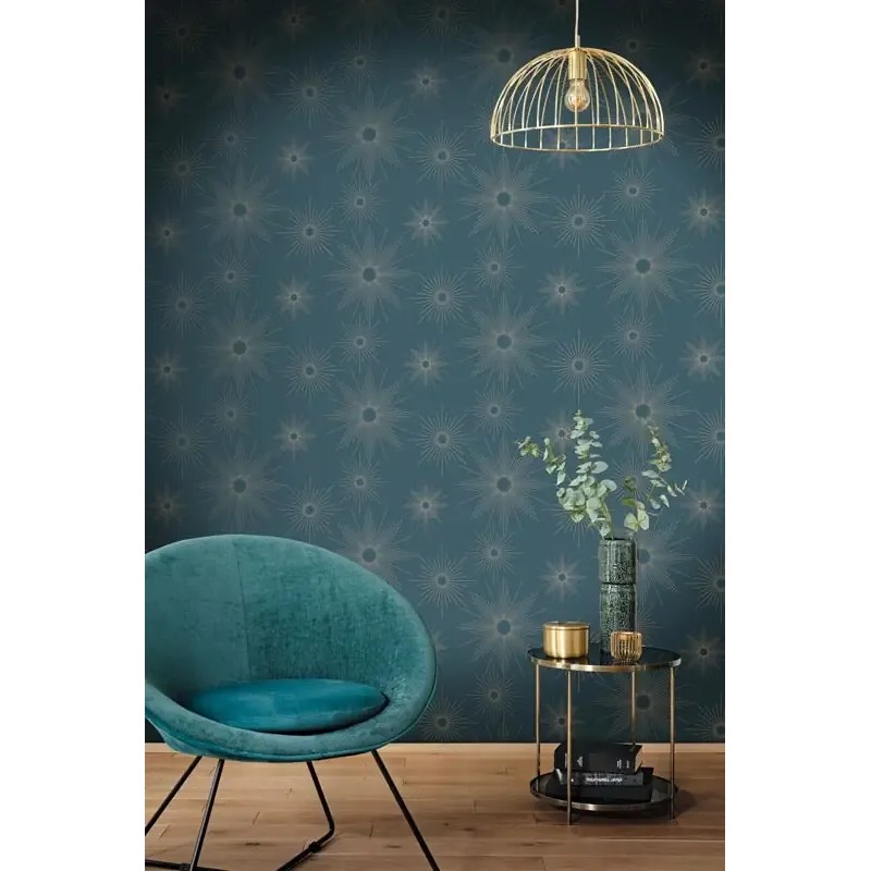 Schlafzimmertapete im Art-Déco-Stil in Blau mit goldenen Sternen. Caselio Golden Age, waschbare Vliestapete. Maße: 53 cm x 10 metros