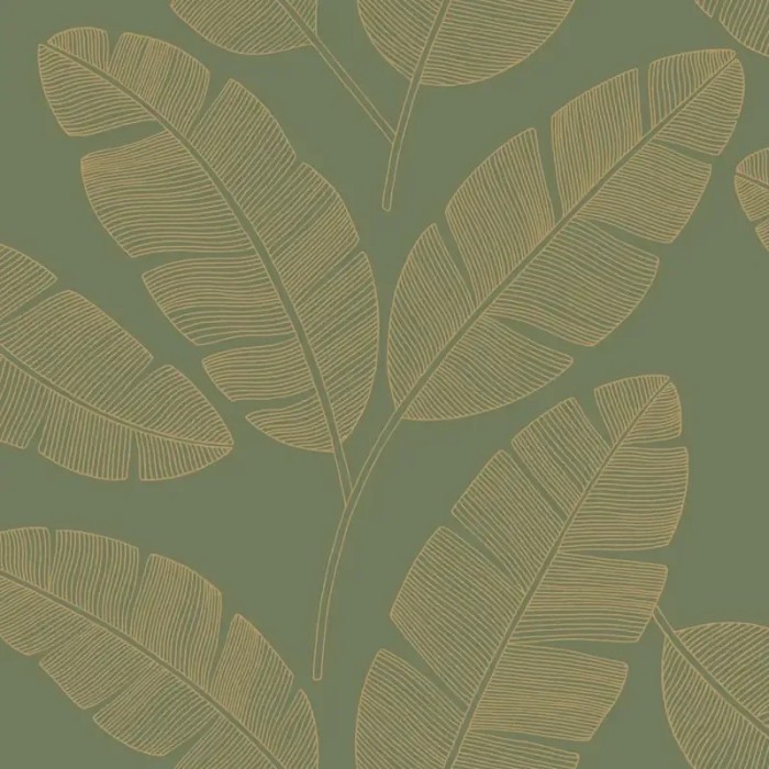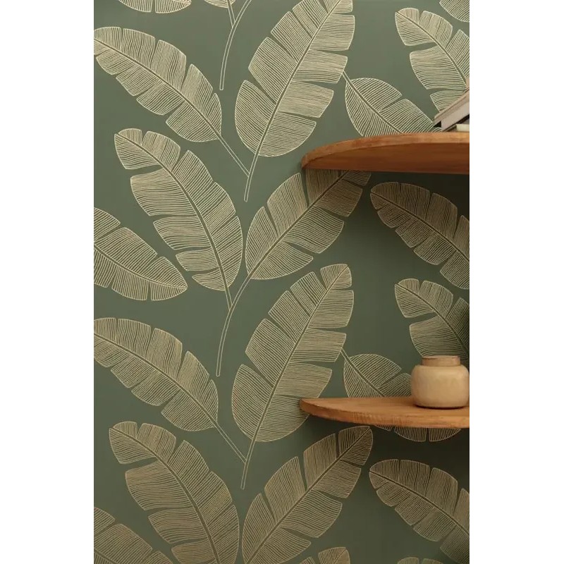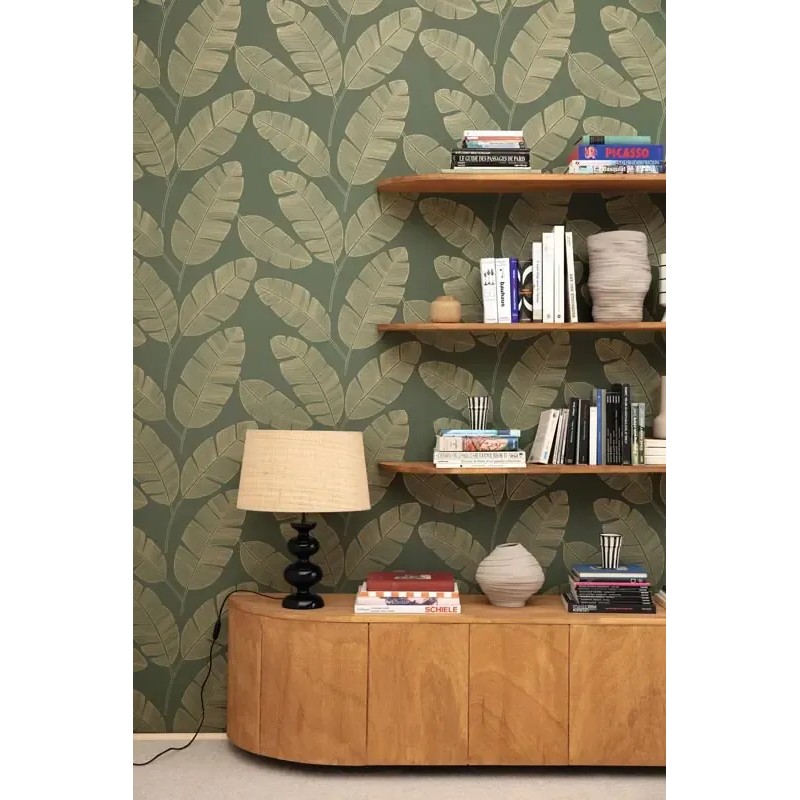 Papel pintado hojas de plátano minimalista verde. Caselio Green & Co, papel de pared calidad tejido no tejido lavable. Medidas: 53 cm x 10 metros