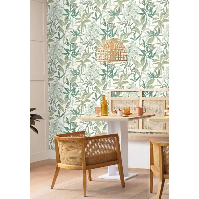 Papel pintado estampado hojas estilo floral verde musgo. Caselio Green & Co, papel de pared calidad tejido no tejido lavable. Medidas: 53 cm x 10 metros