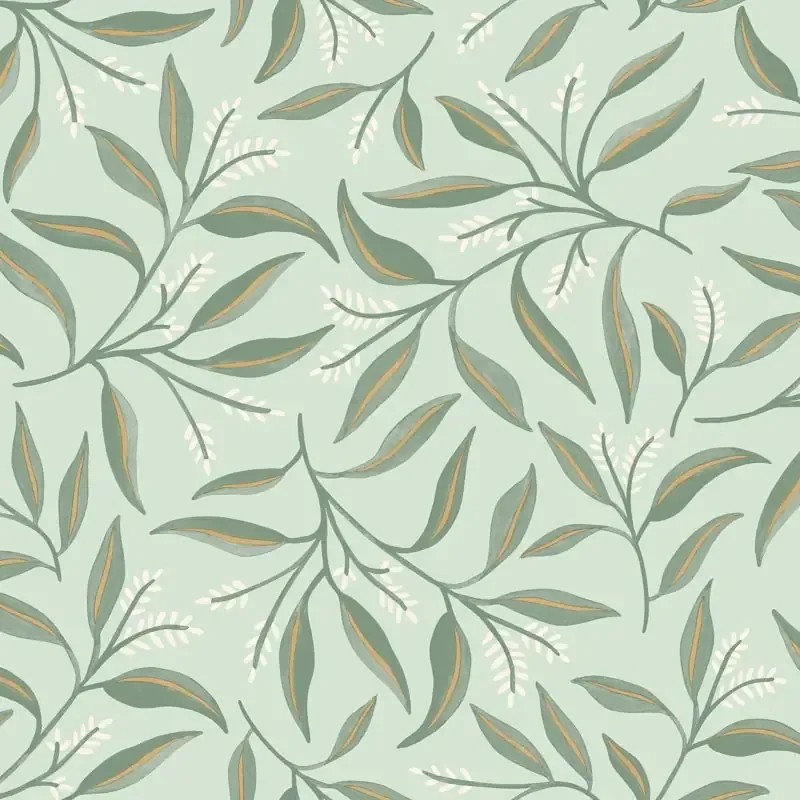 Papel pintado para cocina con ramas de eucaliptos. Caselio Green & Co, papel de pared calidad tejido no tejido lavable. Medidas: 53 cm x 10 metros