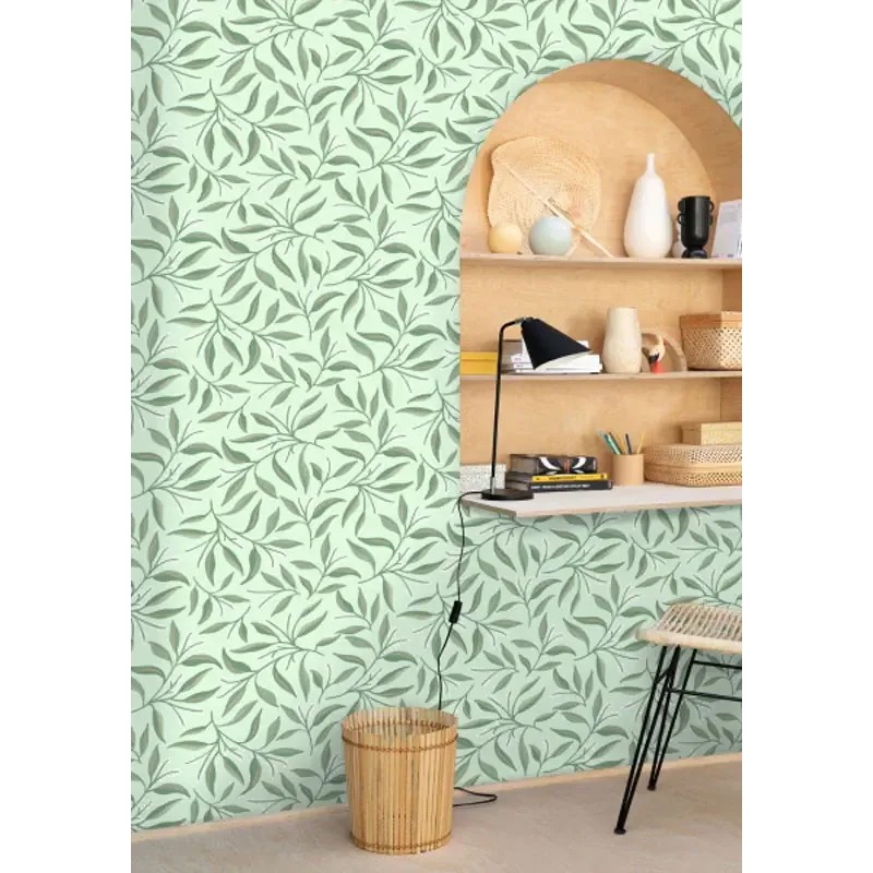 Papel pintado floral hojas eucaliptos verde. Caselio Green & Co, papel de pared calidad tejido no tejido lavable. Medidas: 53 cm x 10 metros