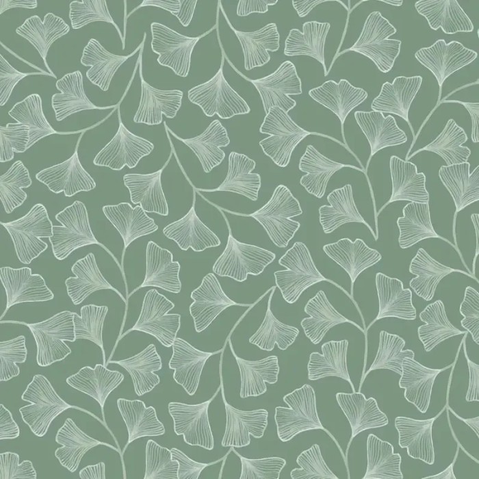 Papel pintado estilo japonés, hojas de ginkgo verde y blanco. Caselio Green & Co, papel de pared calidad tejido no tejido lavable. Medidas: 53 cm x 10 metros
