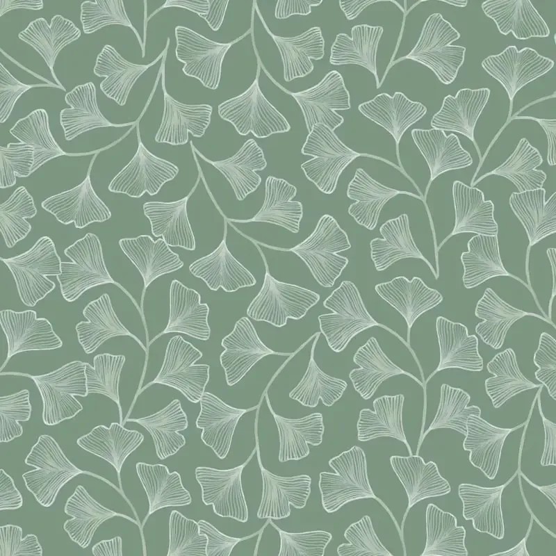 Papel pintado flores japonesas, hojas de ginkgo verde caqui. Caselio Green & Co, papel de pared calidad tejido no tejido lavable. Medidas: 53 cm x 10 metros