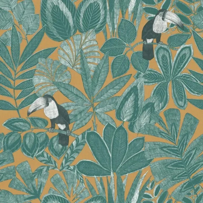 Papel pintado plantas exóticas y tucanes azul y verde. Caselio Green & Co, papel de pared calidad tejido no tejido lavable. Medidas: 53 cm x 10 metros