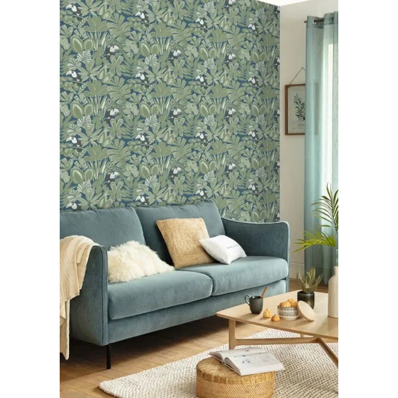 Papier peint plantes exotiques et toucans bleu et vert. Caselio Green & Co, papier peint intissé lavable. Dimensions : 53 cm x 10 m