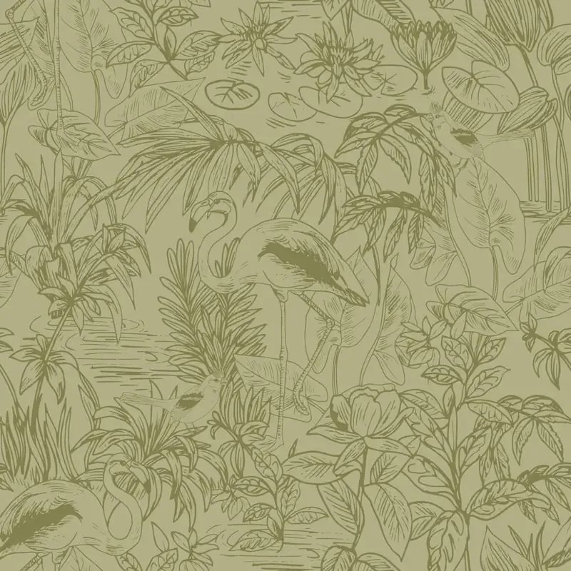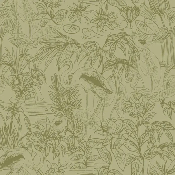 Papel pintado atemporal, marisma con flamencos beige. Caselio Green & Co, papel de pared calidad tejido no tejido lavable. Medidas: 53 cm x 10 metros