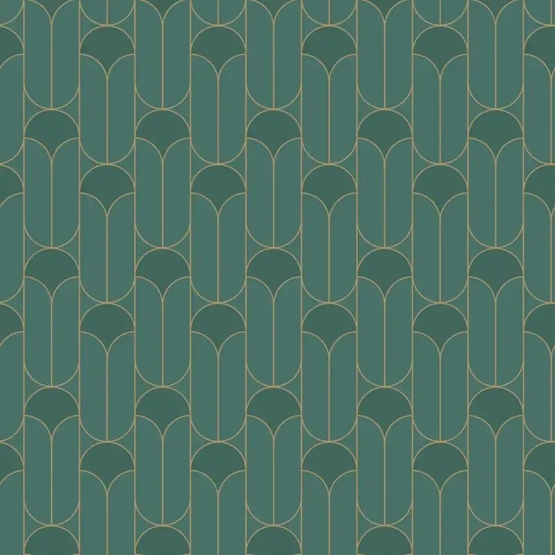 Papel pintado geométrico estilo art decó turquesa y dorado. Caselio Green & Co, papel de pared calidad tejido no tejido lavable. Medidas: 53 cm x 10 metros