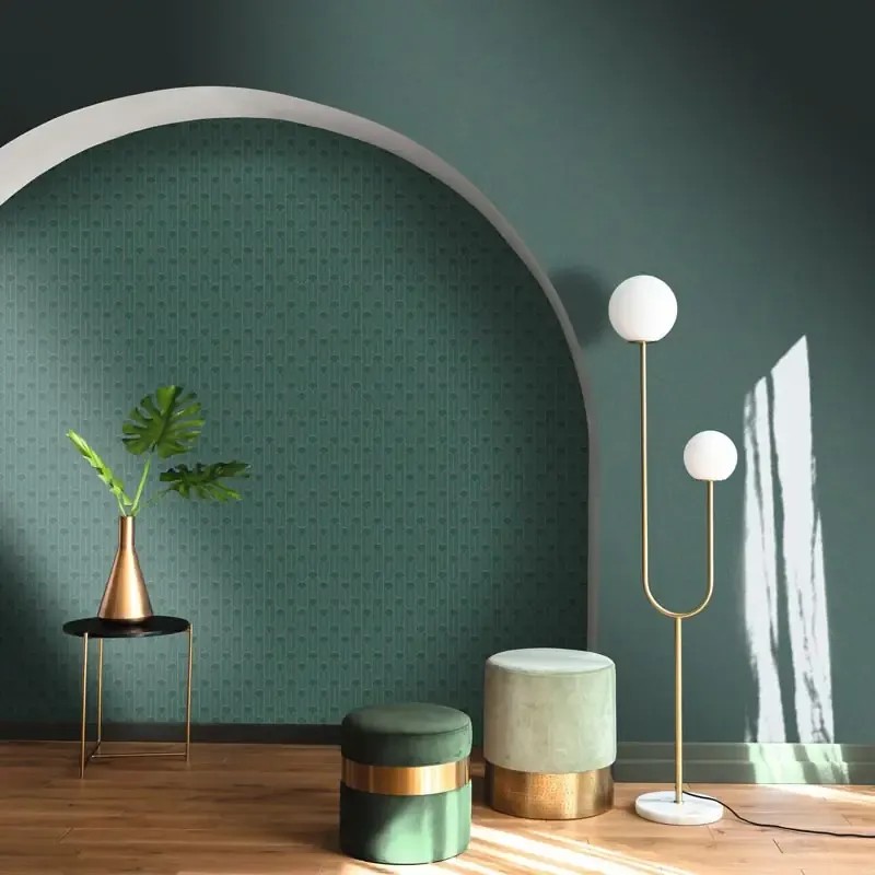 Papel pintado para recibidor estilo art decó verde y dorado. Caselio Green & Co, papel de pared calidad tejido no tejido lavable. Medidas: 53 cm x 10 metros