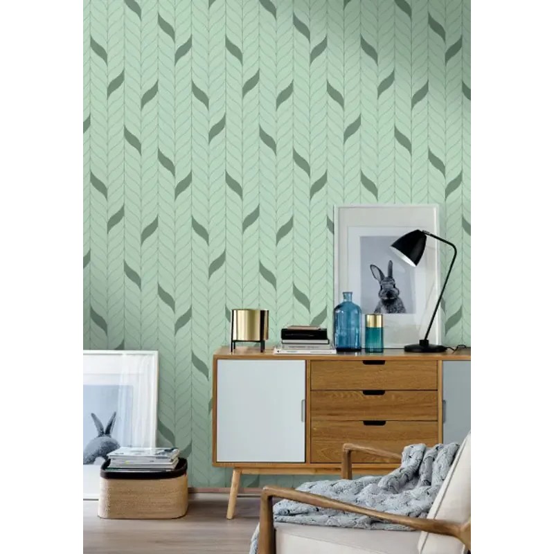 Papel pintado liana con hojas minimalista verde y oro. Caselio Green & Co, papel de pared calidad tejido no tejido lavable. Medidas: 53 cm x 10 metros