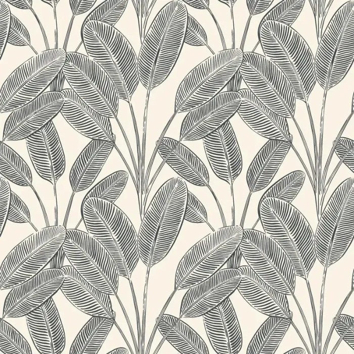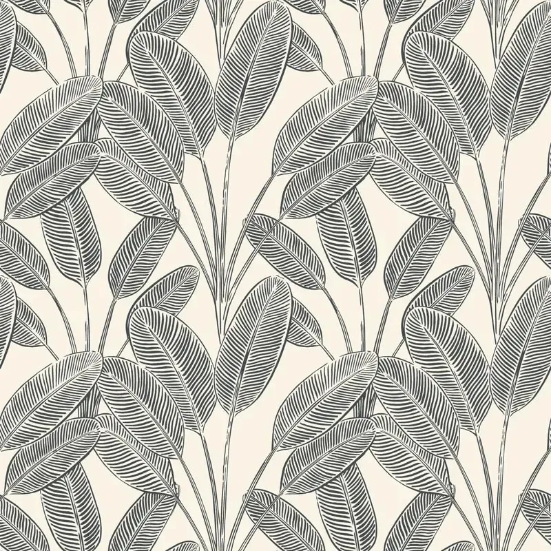 Papel pintado floral hojas grandes blanco negro. Caselio Moonlight, papel de pared calidad tejido no tejido lavable. Medidas: 53 cm x 10 metros