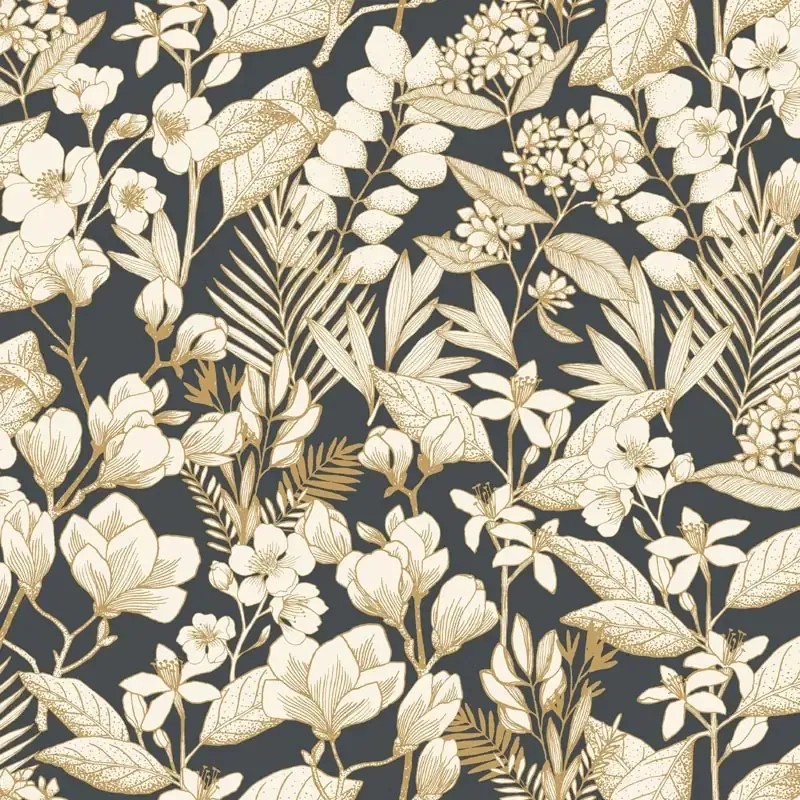 Papel pintado floral, magnolias blanco y negro. Caselio Moonlight, papel de pared calidad tejido no tejido lavable. Medidas: 53 cm x 10 metros