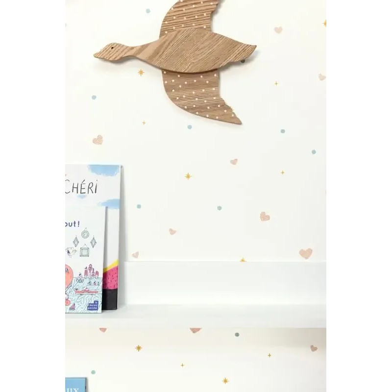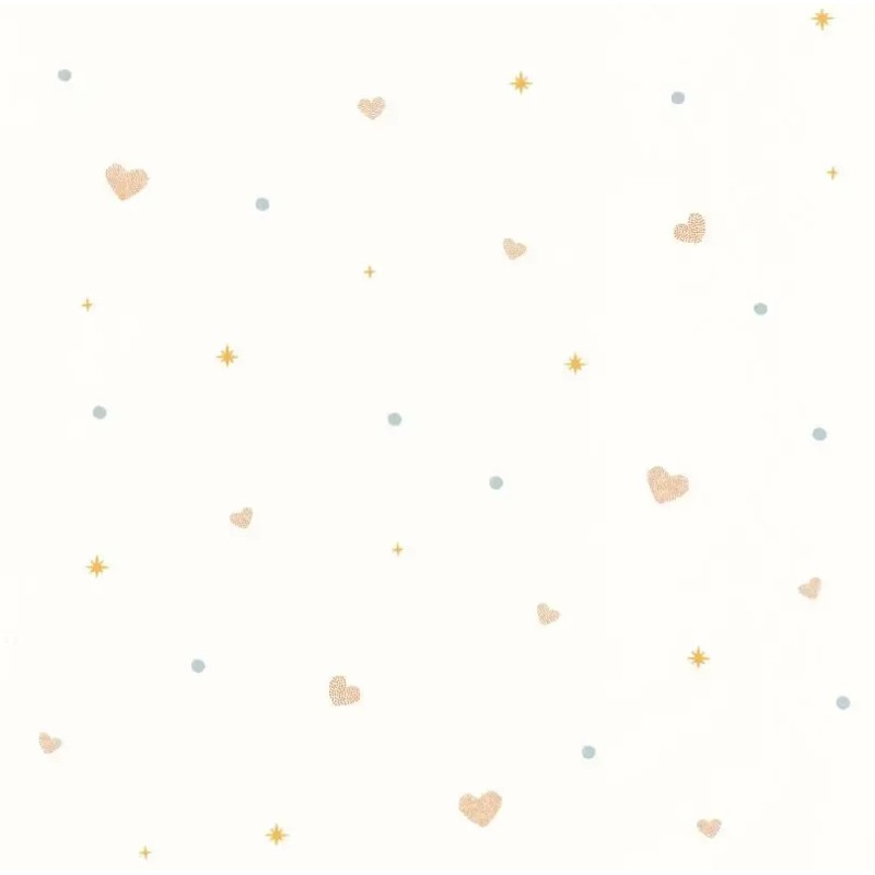 Corazones diminutos, estrellas diminutas, patrones diminutos. He aquí un papel pintado infantil que juega con la sencillez de un fondo claro y liso, conservando al mismo tiempo la fantasía de estos pequeños dibujos como si estuvieran garabateados en una esquina de un cuaderno secreto.