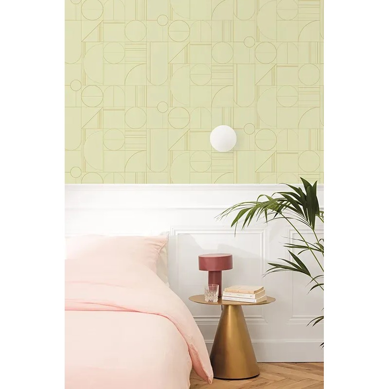 Papel pintado minimalista blanco y dorado, patrón geométrico. Caselio Outlines, papel de pared calidad tejido no tejido lavable. Medidas: 53 cm x 10 metros