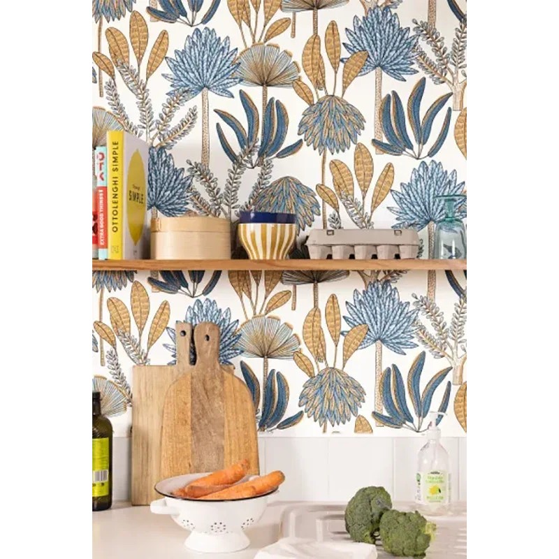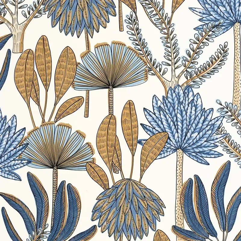 Papel pintado tropical, palmeras azul. Caselio Wild, papel de pared calidad tejido no tejido lavable. Medidas: 53 cm x 10 metros