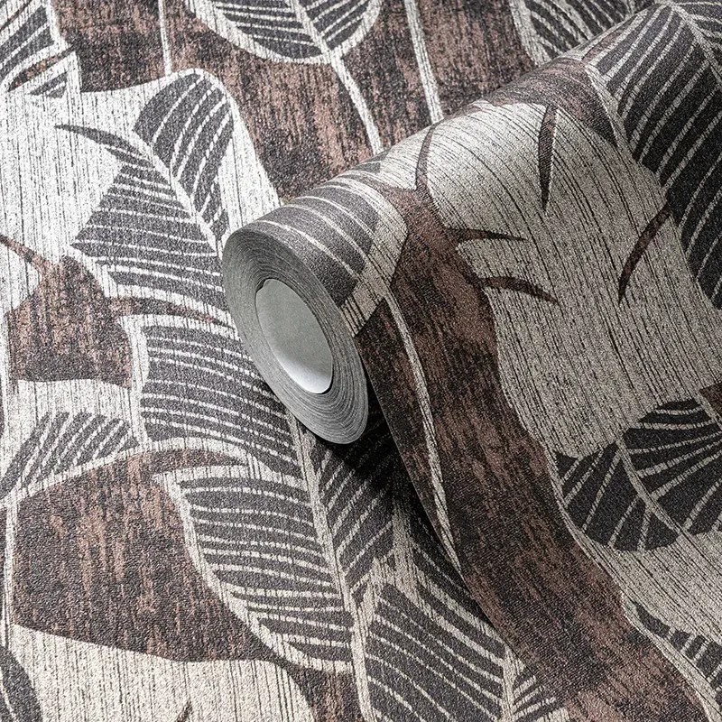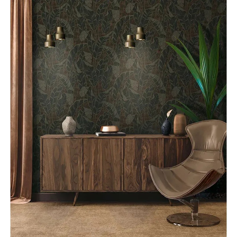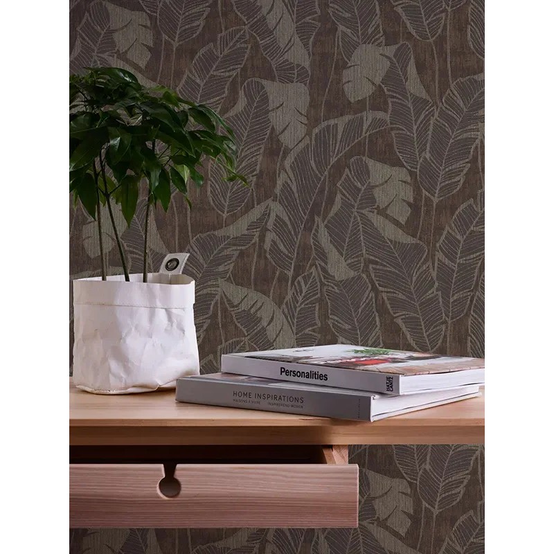 Ideal para transformar cualquier ambiente con encanto. Papel pintado hojas banano marrón, dorado, negro As Creation Jade 395021.
