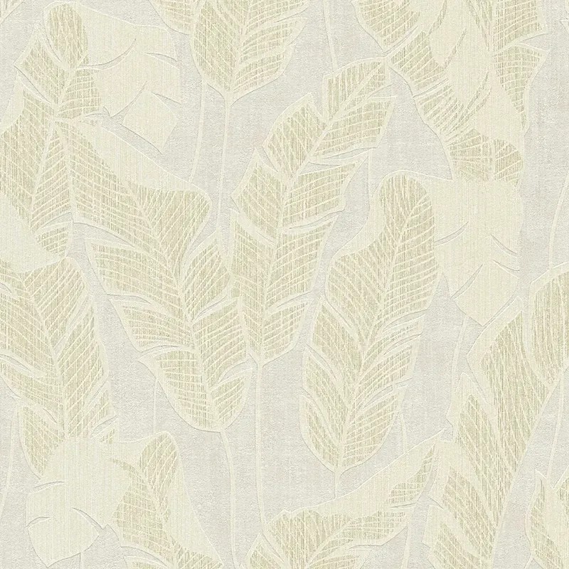 Estilo decorativo que se adapta a distintos espacios del hogar. Papel pintado hojas banano o plátano beige, verde As Creation Jade 395022.
