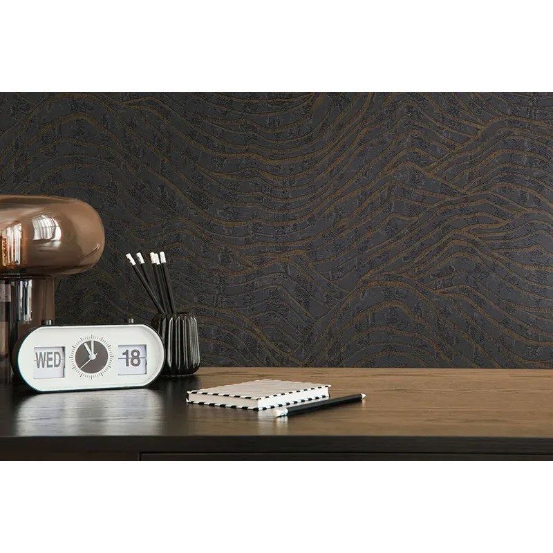 Añade carácter a tus estancias con este diseño versátil. Papel pintado oriental moderno azul, dorado As Creation Jade 397071.