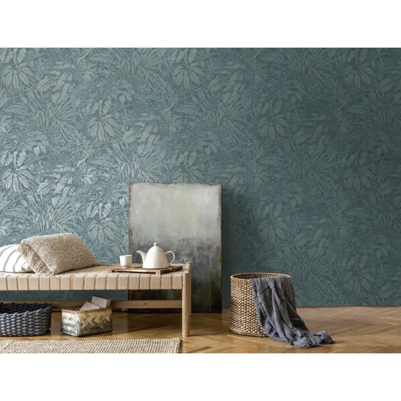 Papel pintado plantas selváticas azul petróleo, verde, Perfecto para interiores que buscan calidez y estilo. AS Creation Smart Surfaces 395603.
