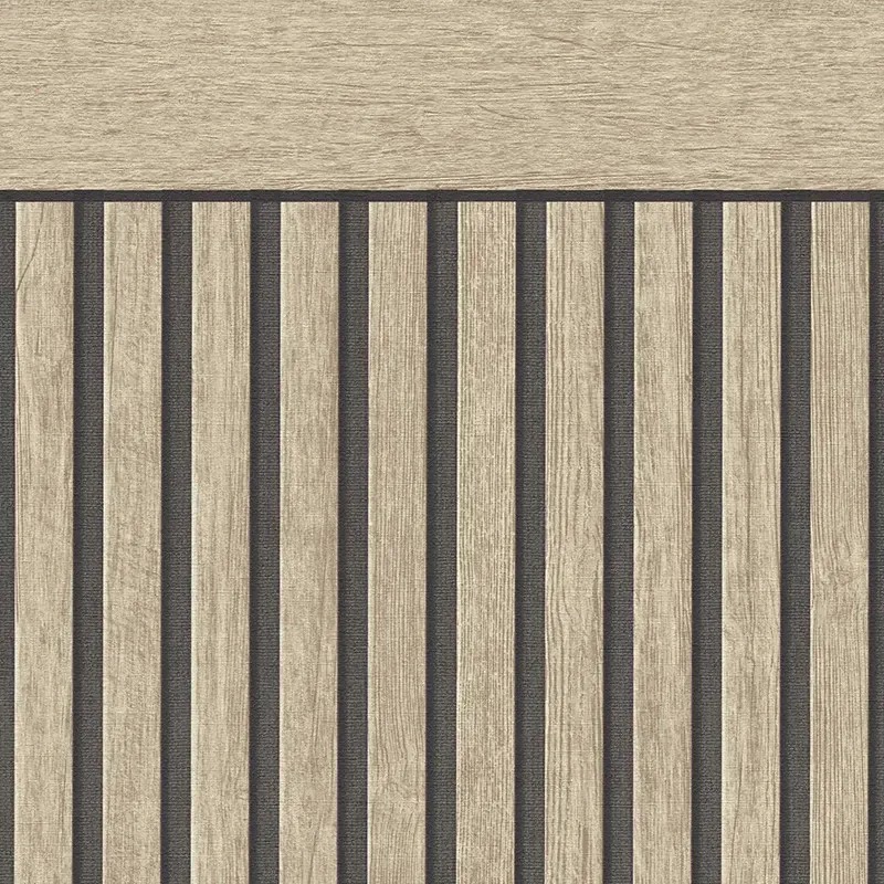 Papel pintado friso listón madera escandinavo, Estilo decorativo que se adapta a distintos espacios del hogar. As Creation Wallpanel 397444.