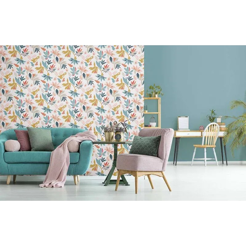Papel pintado flores blanco, azul y rojo vectorizado, refleja buen gusto y modernidad. Marburg Flora 47467.