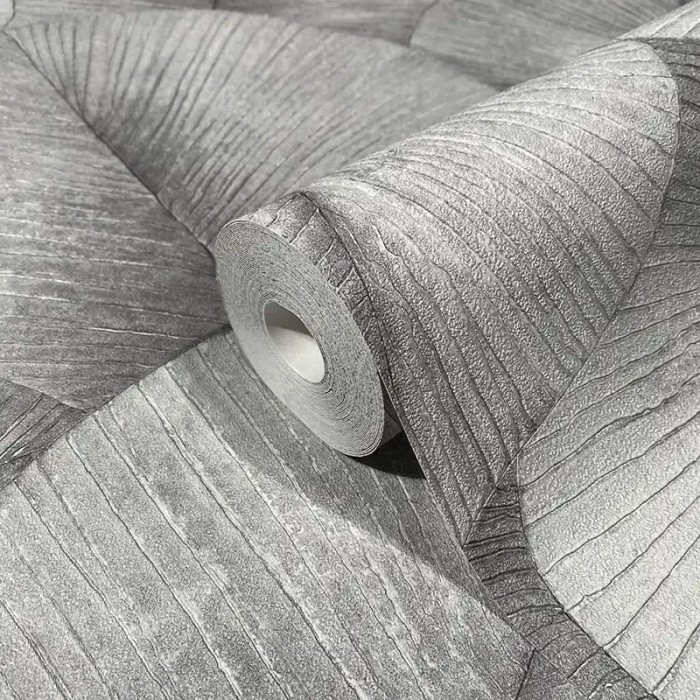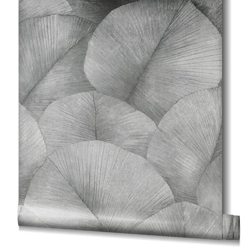Papel pintado floral gris claro hojas grandes 3D, con un efecto visual llamativo. Marburg Kumano 34509.
