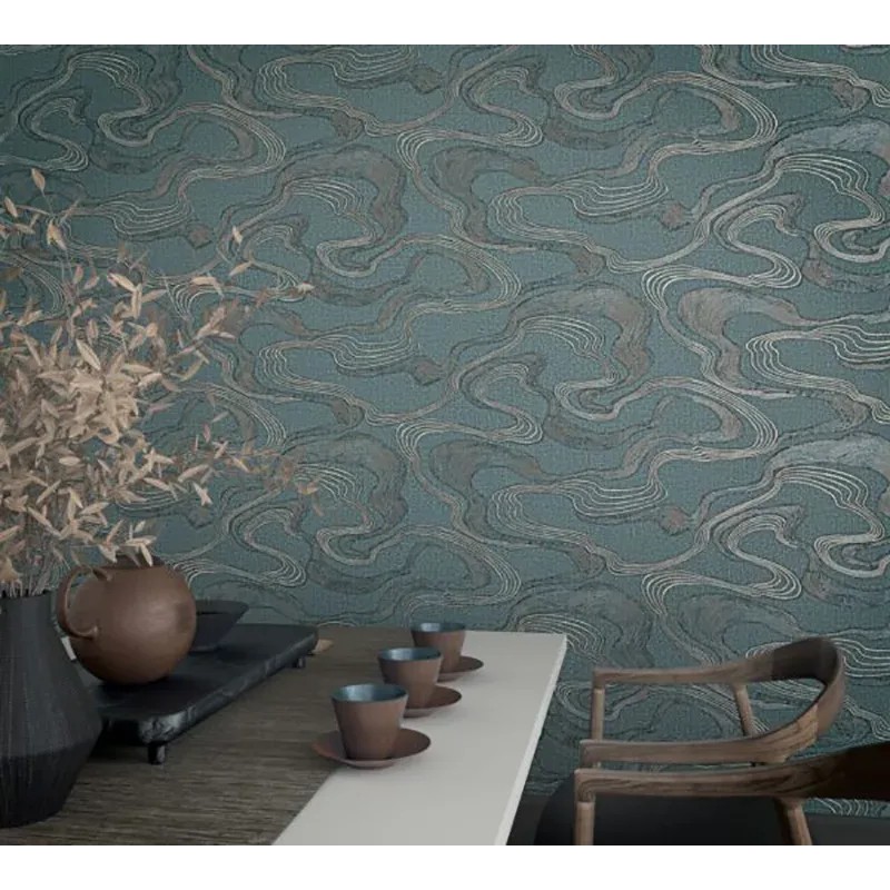 Papel pintado moderno verde dorado estilo japonés de Marburg, colección Kumano, calidad tejido no tejido lavable. Medidas: 53 cm x 10 metros
