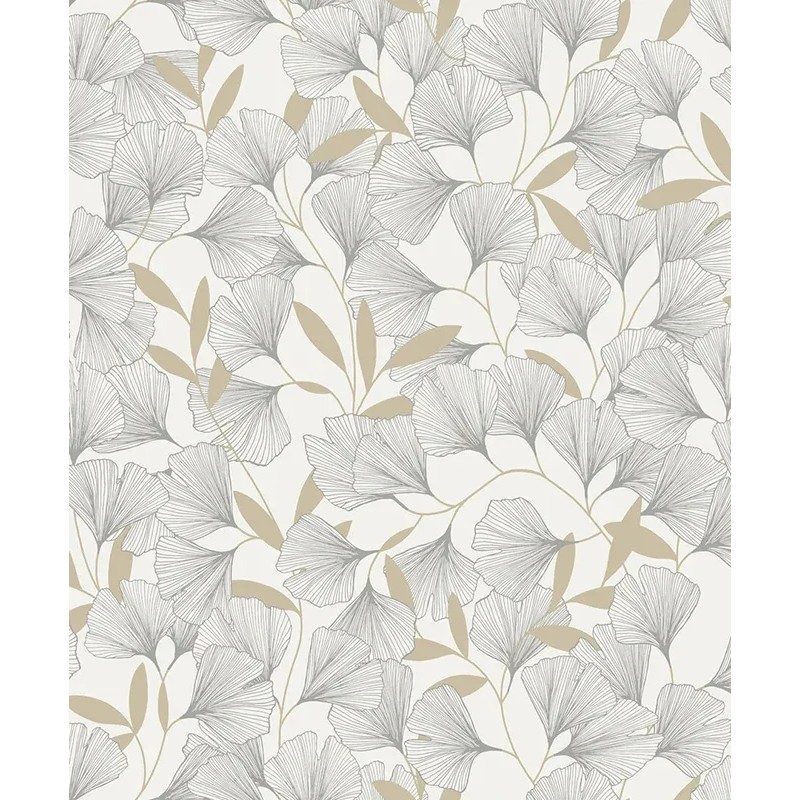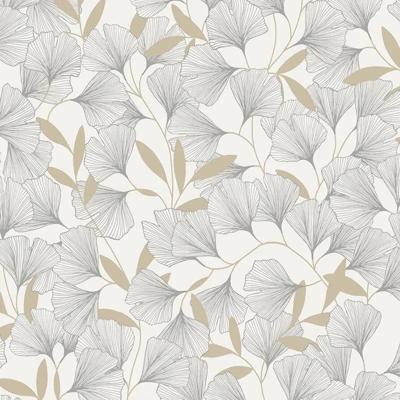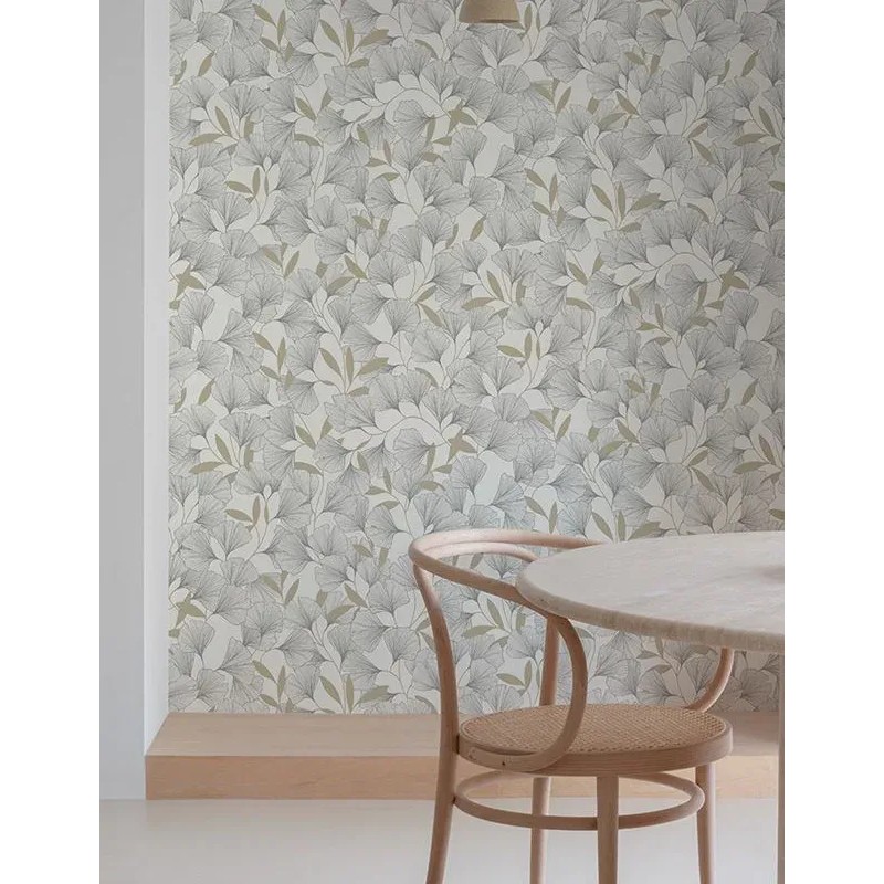 Papel pintado floral japonés hojas ginkgo verde. Crea un ambiente acogedor ideal para el recibidor. Un papel pintado con personalidad propia.