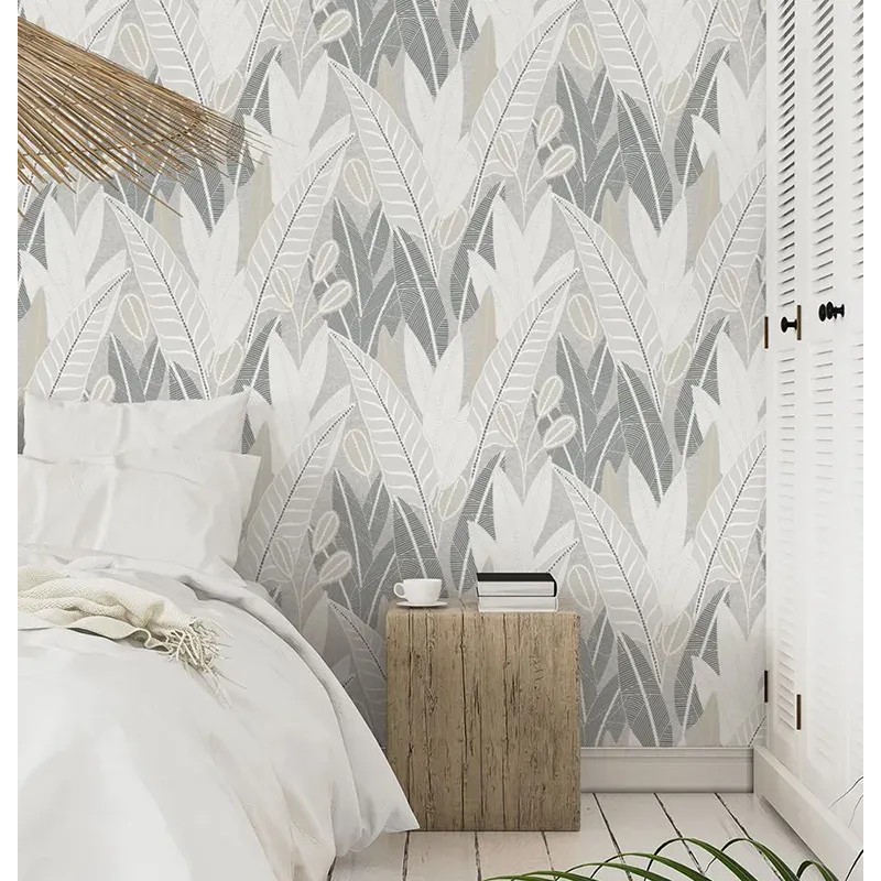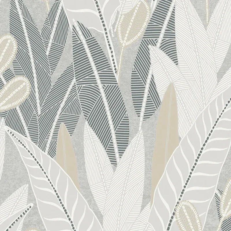 Papel pintado floral étnico plantas africanas gris. Decora con encanto para el salón. Ideal para quienes buscan calidez y estilo.