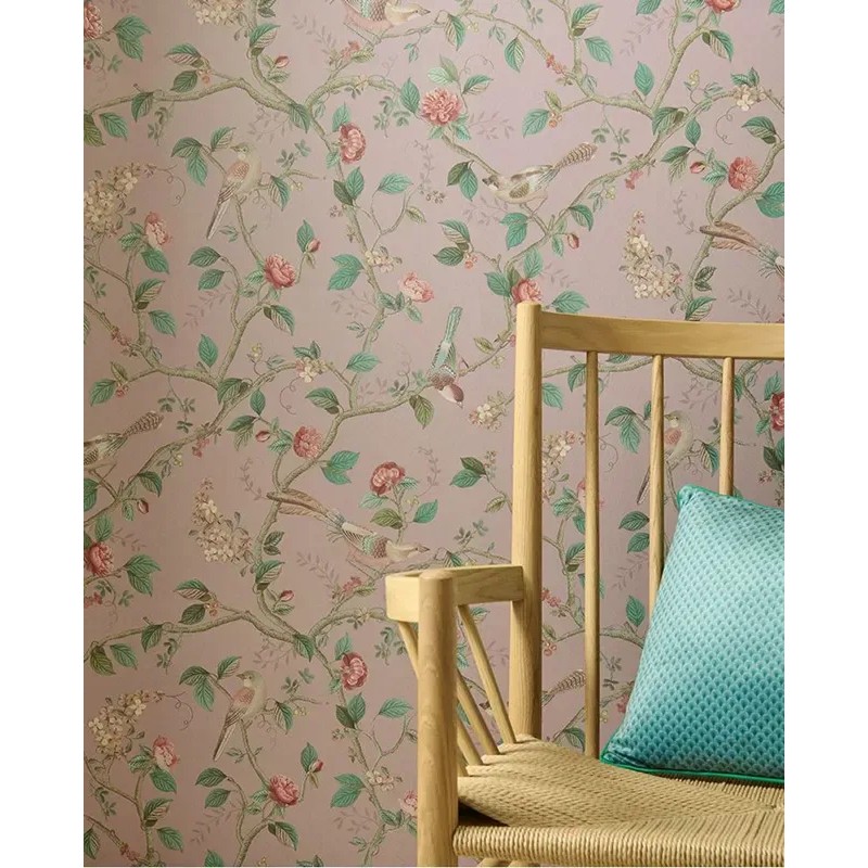 Papel pintado romántico verde con flores y pájaros, pensado para aportar frescura y vitalidad al ambiente. Pip Studio de Eijffinger, papel de pared calidad tejido no tejido lavable. Medidas: 52 cm x 10 metros