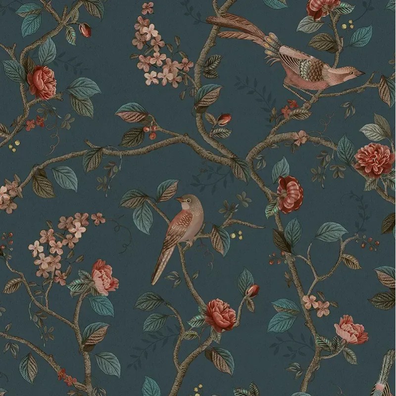 Papel pintado romántico verde con flores y pájaros, pensado para aportar frescura y vitalidad al ambiente. Pip Studio de Eijffinger, papel de pared calidad tejido no tejido lavable. Medidas: 52 cm x 10 metros