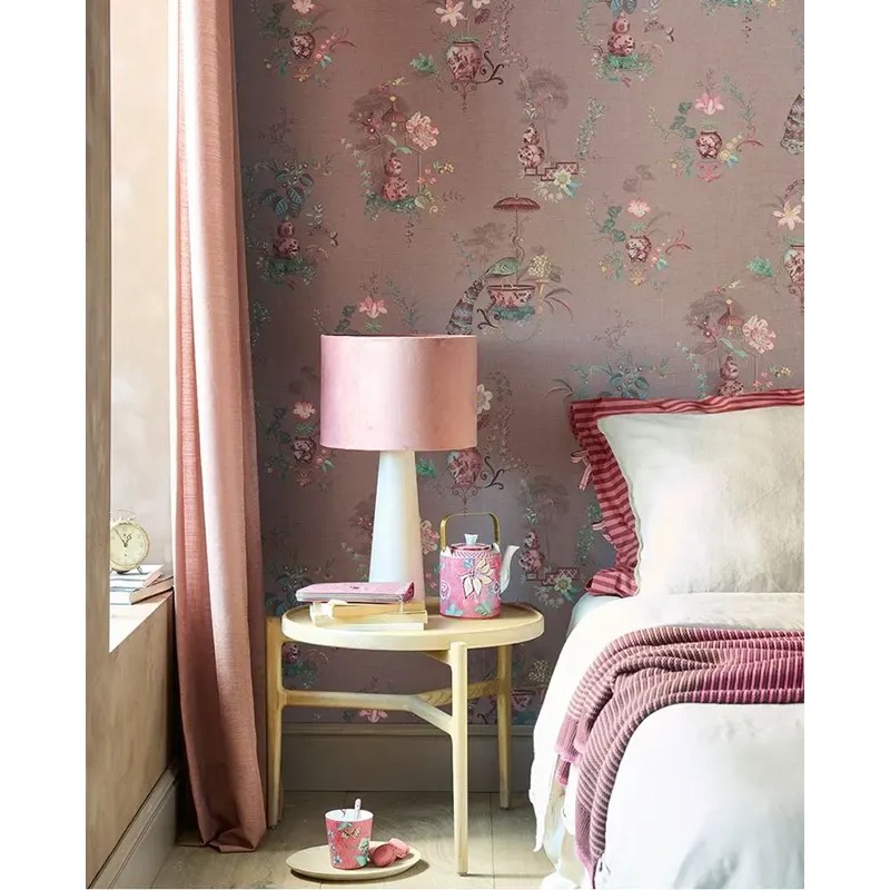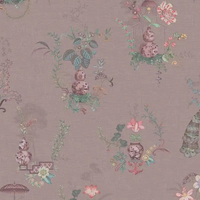 Papel pintado romántico con jarrones de porcelana china y flores beige, un diseño exótico y delicado para interiores. Pip Studio de Eijffinger, papel de pared calidad tejido no tejido lavable. Medidas: 70 cm x 10 metros