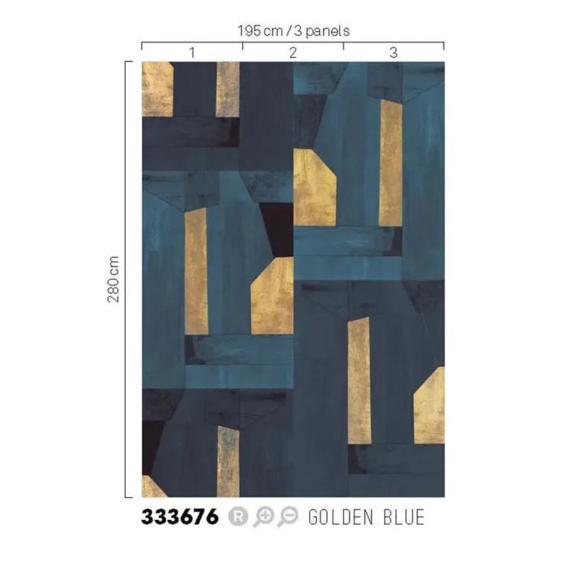 Mural pared moderno composición abstracta azul dorado de Eijffinger, colección Revive. Medidas: 195 x 280 cm.