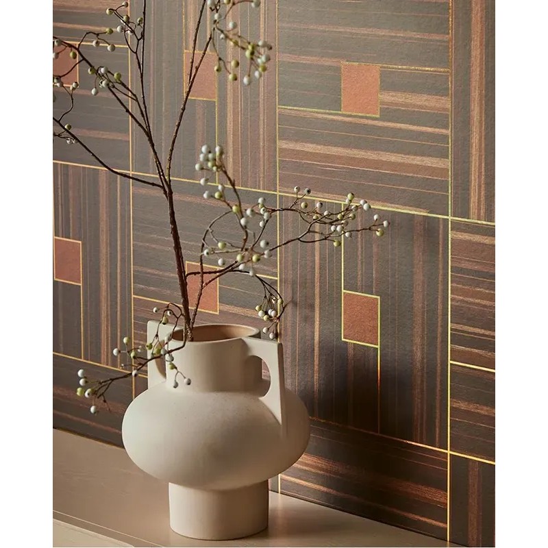 En este fotomural impreso digitalmente se alternan brillantes líneas metálicas con bloques de chapa y diamantes. Entre rayas y cuadros geométricos darás una estética gam chic en tus paredes.