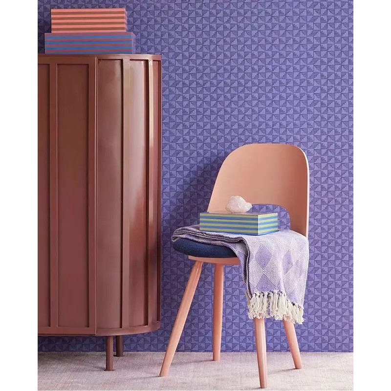 Papel pintado patrón textil años violeta lila retro chic de Eijffinger, colección Revive. Medidas: 52 cm x 10 m. Papel de pared tejido no tejido y lavable.