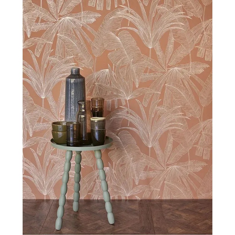 Papel pintado plantas tropicales rosa durazno rústico de Eijffinger, colección Festival. Medidas: 68 cm x 10 m. Papel de pared tejido no tejido y lavable.