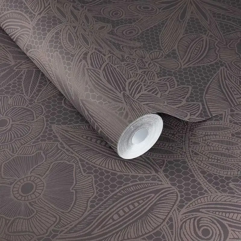 Papel pintado encaje floral negro romántico de Eijffinger, colección Gilded. Medidas: 69 cm x 10 m. Papel de pared tejido no tejido y lavable.