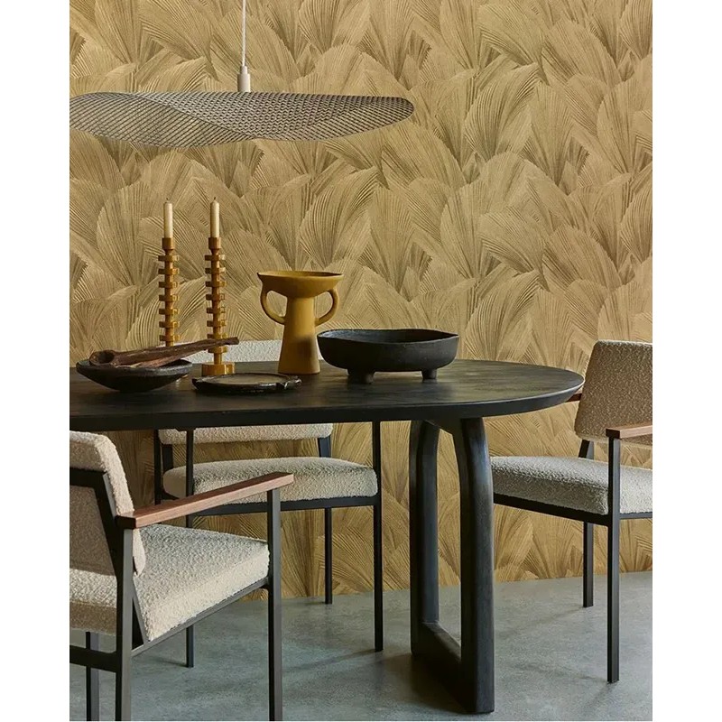 Papel pintado hojas de palma dorado jungle chic de Eijffinger, colección Gilded. Medidas: 52 cm x 10 m. Papel de pared tejido no tejido y lavable.