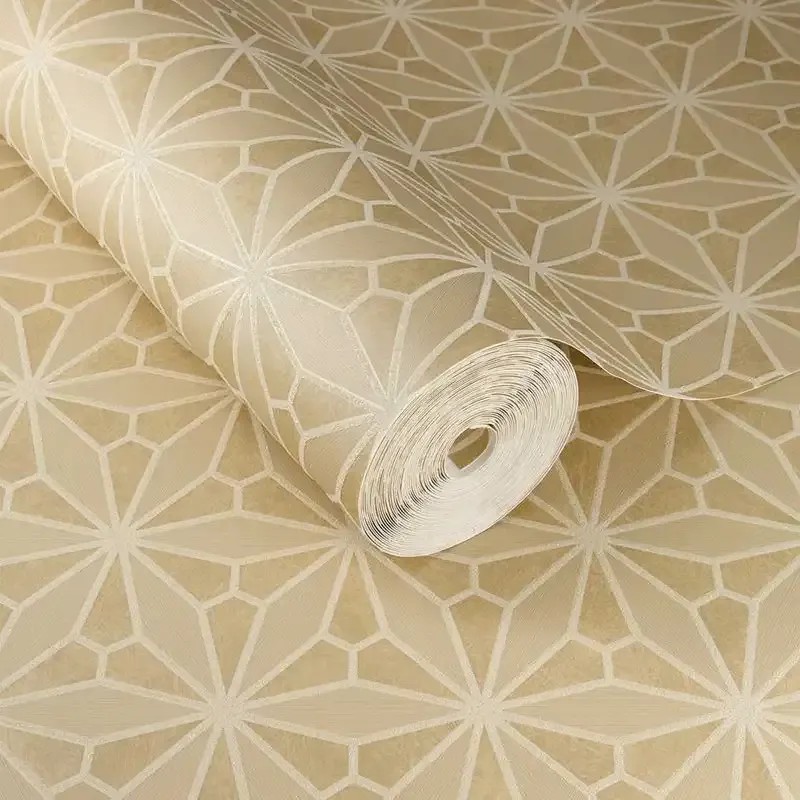 Papel pintado vidriera oriental beige geométrico de Eijffinger, colección Gilded. Medidas: 52 cm x 10 m. Papel de pared tejido no tejido y lavable.