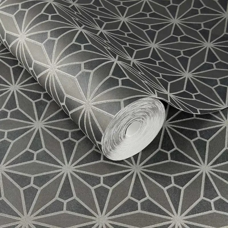 Papel pintado vidriera oriental gris geométrico de Eijffinger, colección Gilded. Medidas: 52 cm x 10 m. Papel de pared tejido no tejido y lavable.