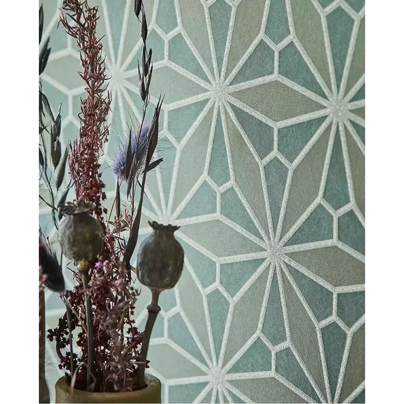 Papel pintado vidriera oriental verde geométrico de Eijffinger, colección Gilded. Medidas: 52 cm x 10 m. Papel de pared tejido no tejido y lavable.