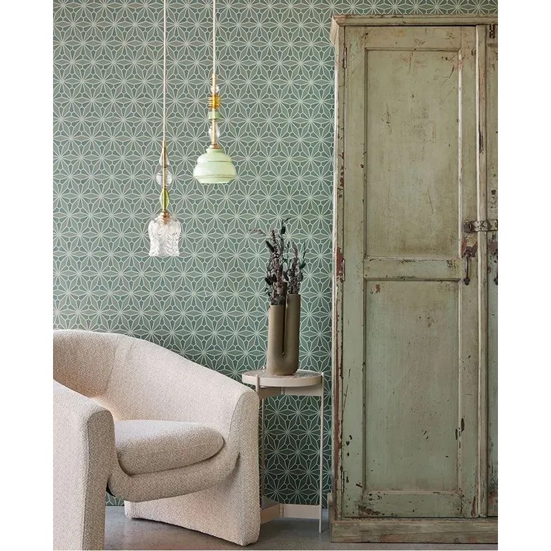Papel pintado vidriera oriental verde geométrico de Eijffinger, colección Gilded. Medidas: 52 cm x 10 m. Papel de pared tejido no tejido y lavable.