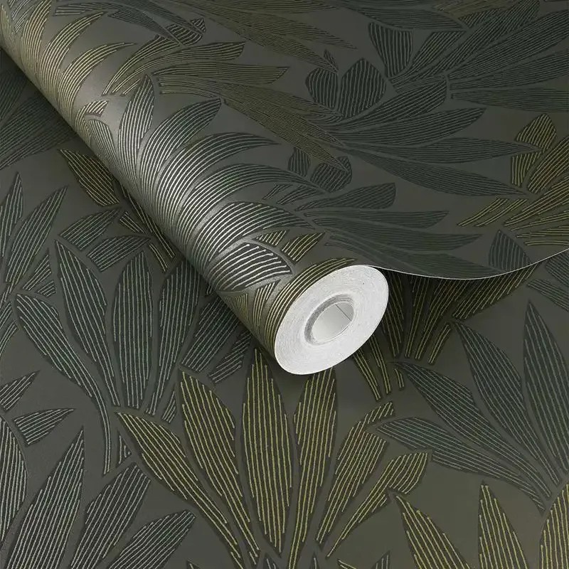 Papel pintado hojas minimalistas verde oliva oro metalizado moderno de Eijffinger, colección Gilded. Medidas: 52 cm x 10 m. Papel de pared tejido no tejido y lavable.