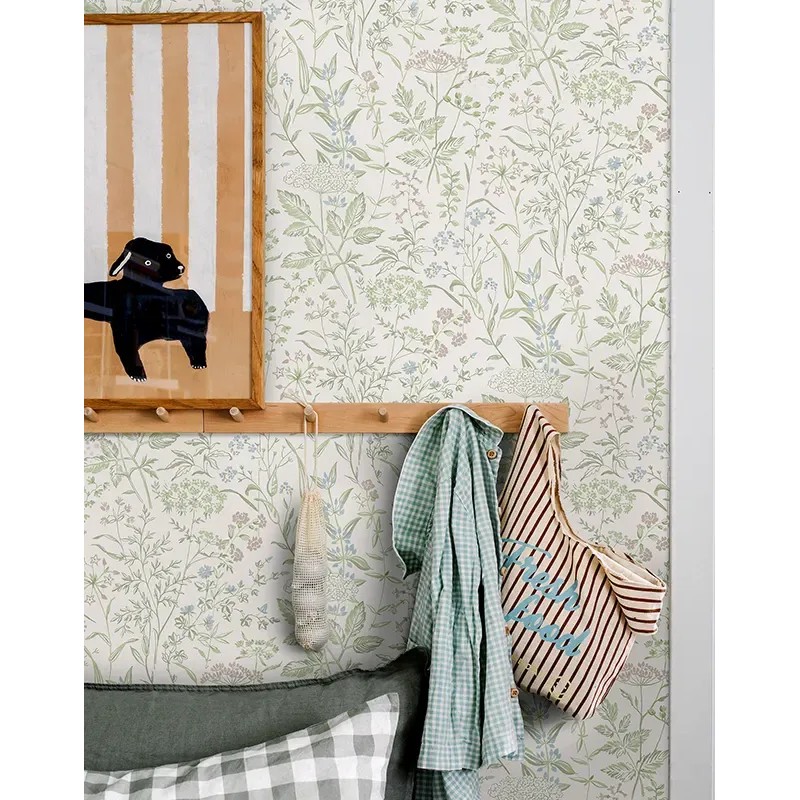 Papel pintado flores del prado verde vintage