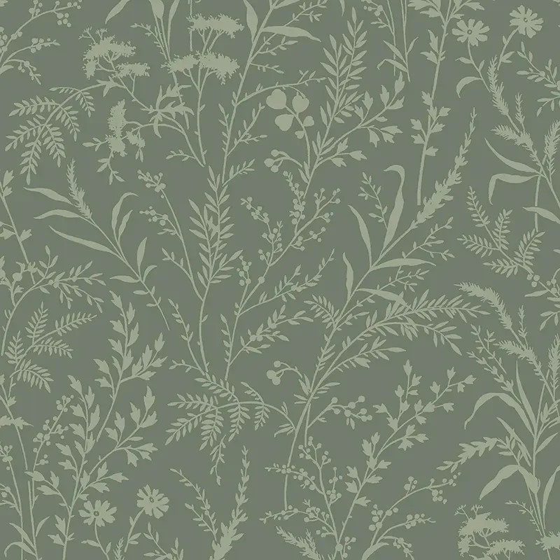 Wallpaper Scandinavian style meadow flowers and leaves in green by Borastapeter, Borosan Hem collection. Washable and Non-woven quality, size: 53 cm x 11,2 m.