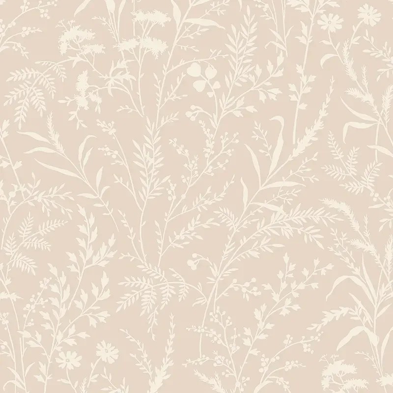 Papel pintado escandinavo flores y hojas de prado en beige de Borastapeter, colección Borosan Hem. Calidad tejido no-tejido lavable, medidas: 53 cm x 11,2 m.