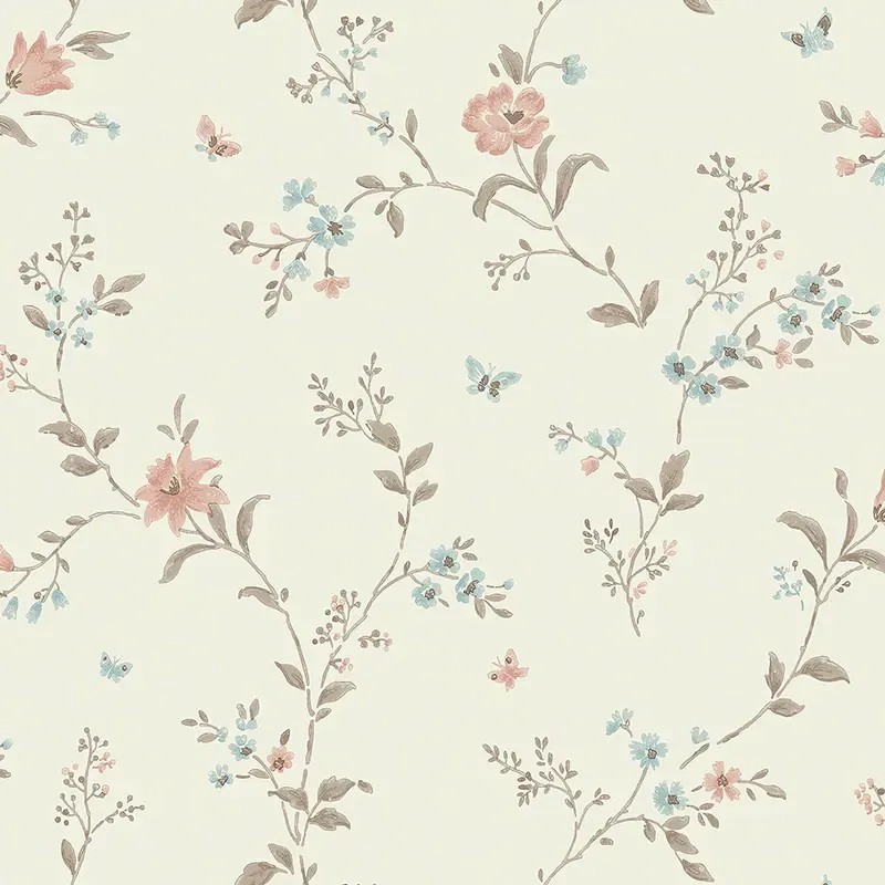 Papel pintado romántico diseño floral años 30 en blanco y multicolor de Borastapeter, colección Borosan Hem. Calidad tejido no-tejido lavable, medidas: 53 cm x 11,2 m.